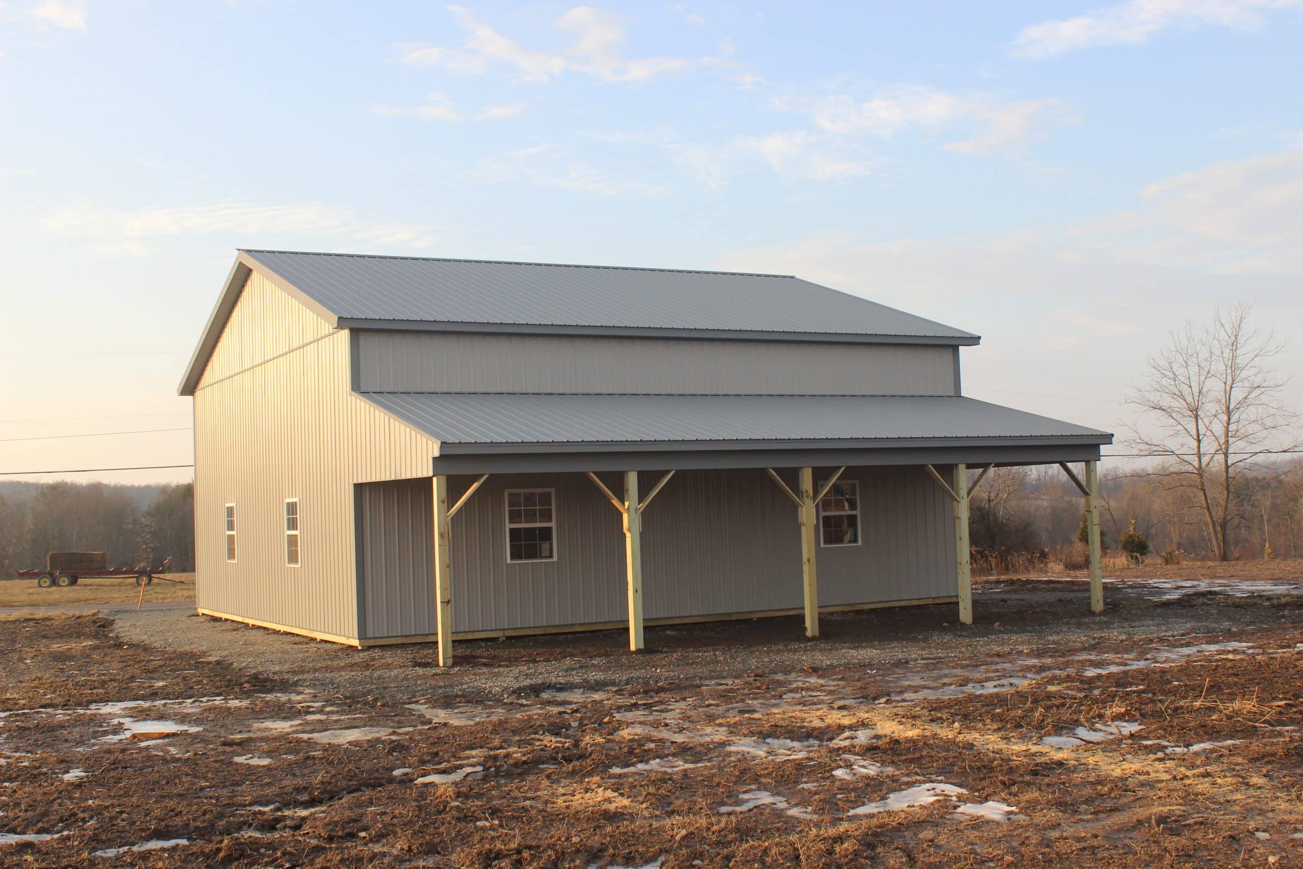 This 24’x26’x10’ pole barn features 3-ply glu-lam posts on precast footers with sakrete, 2-ply SYP headers, and 9/12 pitch attic trusses 24" o/c for added storage. It includes 12” overhangs with vented metal soffit, Everlast metal roofing and siding with a vapor barrier, and full steel trim. There's also an insulated 8’x8’ garage door with decorative hardware, a fiberglass entry door, four vinyl windows, and a finished 14’x6’8” attic room with OSB flooring, sidewall sheathing, and a split staircase with landing and railings.