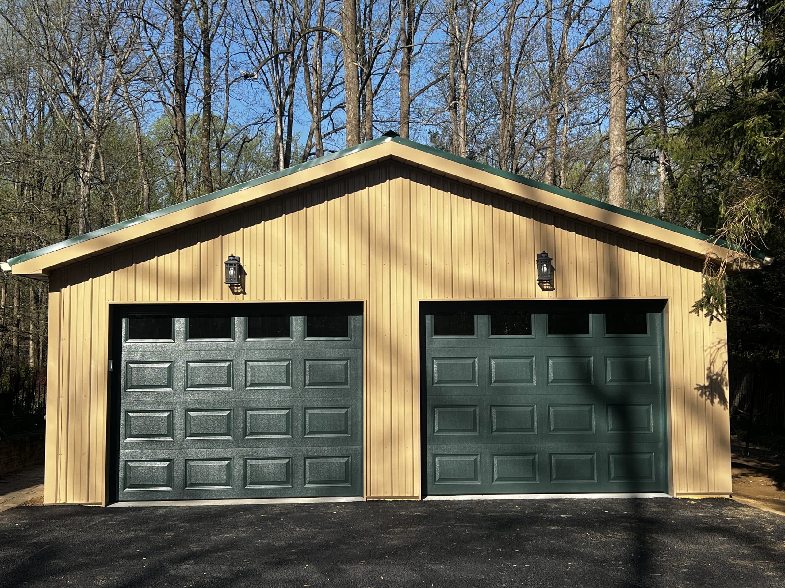 • Prefabricated trusses, 4/12 pitch, spaced 4' on center • Double 2x10 MSR truss bearers • 3-ply 2x6 glu-lam posts with GreenPost wrap, spaced per drawings • (1) 5”x16” concrete foundation block and (1) 80 lb bag of Sakrete per post • 2x4 truss bracing with 2x6 truss blocks • 2x4 roof purlins and wall girts, spaced 2' on center • Treated 2x8 skirtboard around perimeter of building • Everlast Omni Series 28 ga. steel roof and wall panels, screw attached • 12” overhangs • Vented ridge • Steel fascia with aluminum vented soffit • R-9 vapor barrier under roof panels • (1) 3068 9-lite ProVia fiberglass hinged entry door with lockset. Color: Forest Green • (2) 9'Wx7'H Amarr Lincoln 3000 overhead doors with window panel (openers included). Color: Hunter Green • 4” concrete with fiber on stone base with 6 mil vapor barrier, control joints, smooth finish