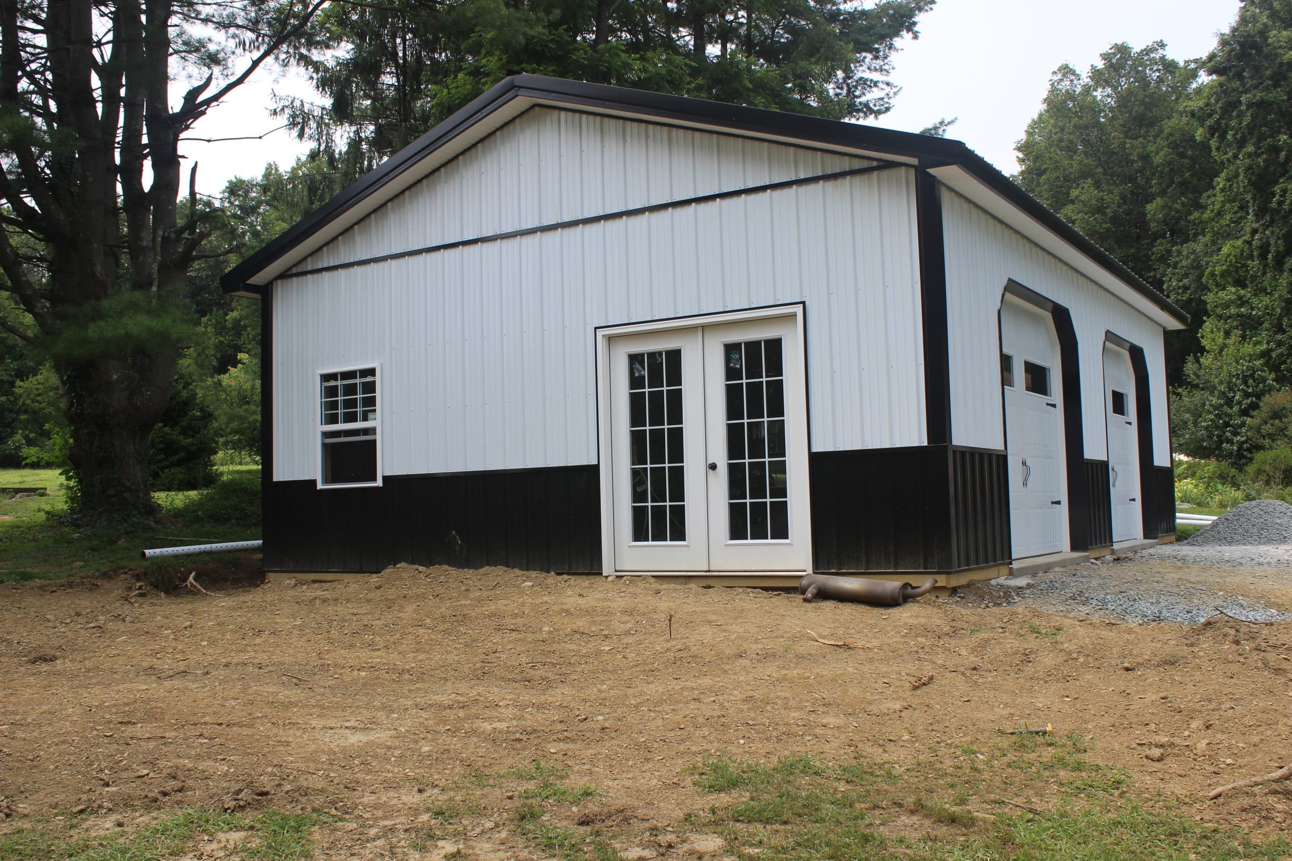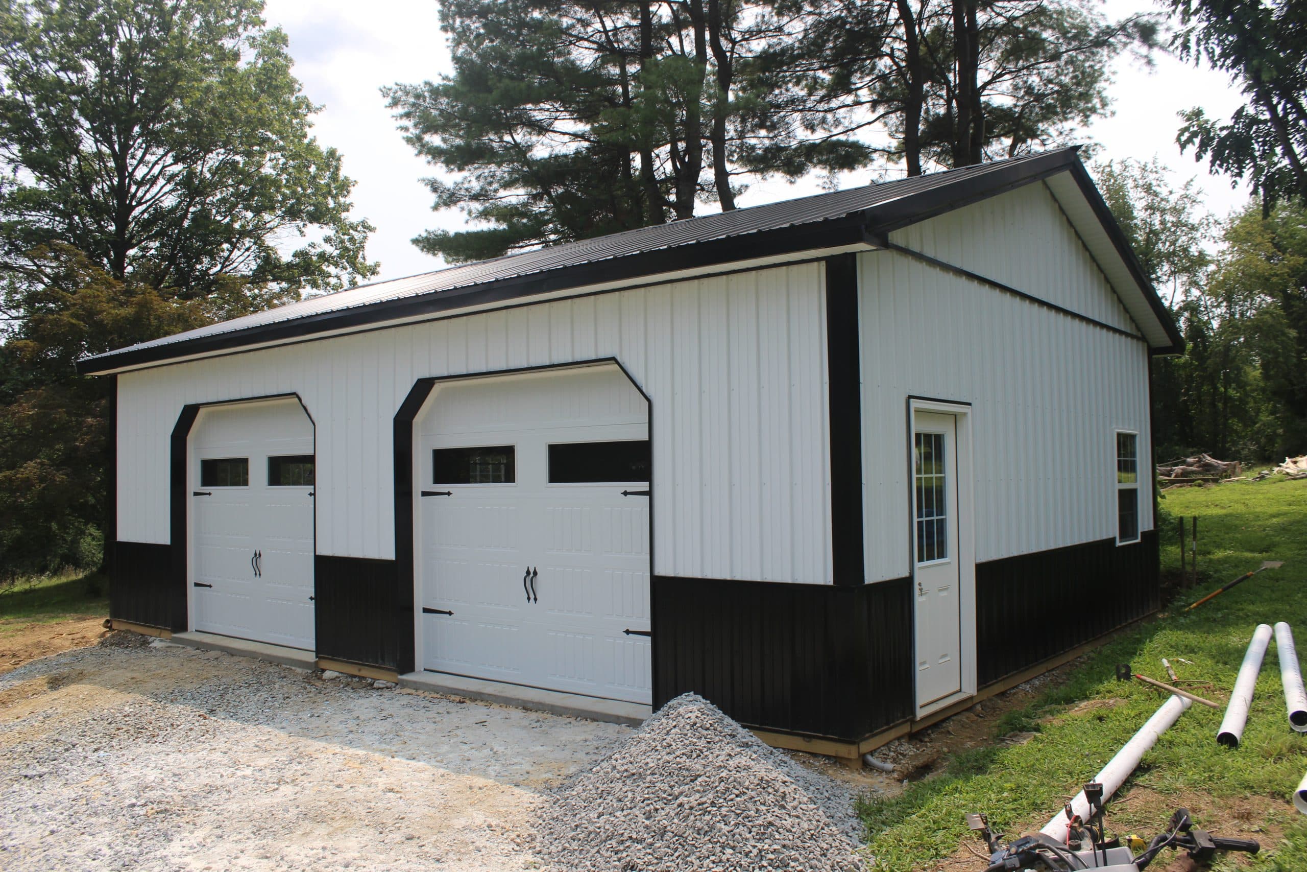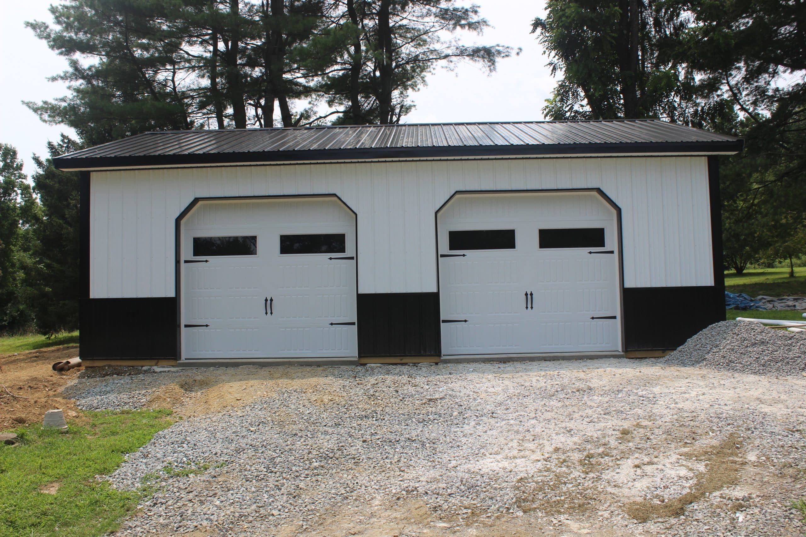 This 24x 32x 10 Garage was built with 2x6 Glulam posts, concrete footings and Sakrete per post, 4/12 pitch prefabricated trusses. The roof, siding and wainscot are Everlast Omni Series 27 Ga. metal. Included in the package are two single hung vinyl windows with grids, one double 15-lite door, one 9-lite entry door and two insulated, raised panel, wood grain overhead doors.