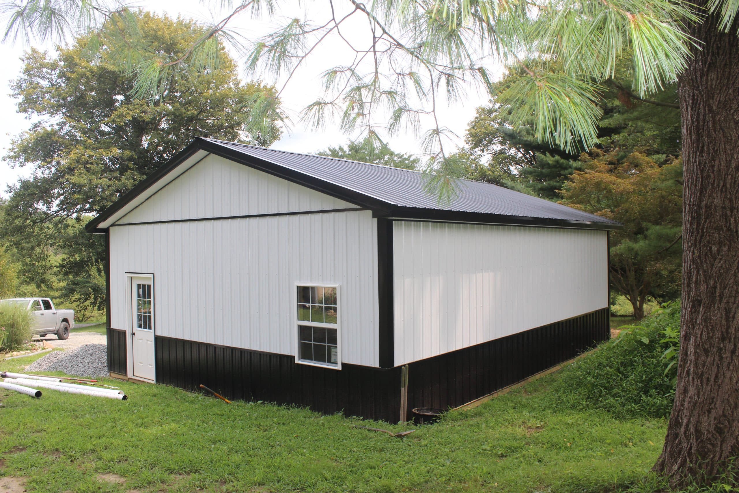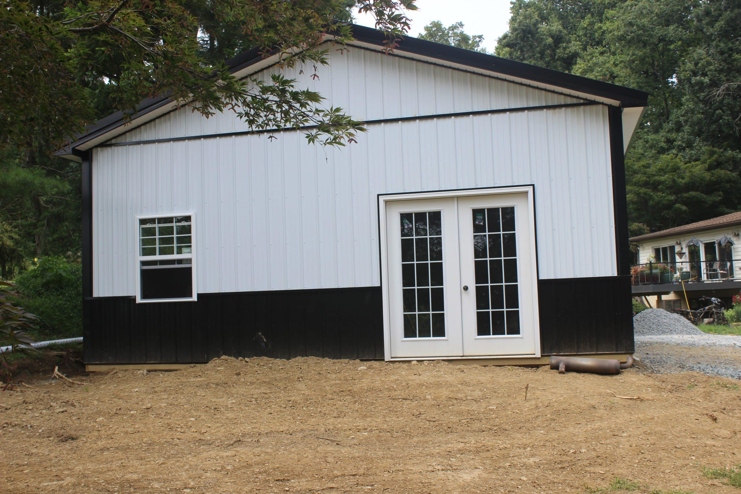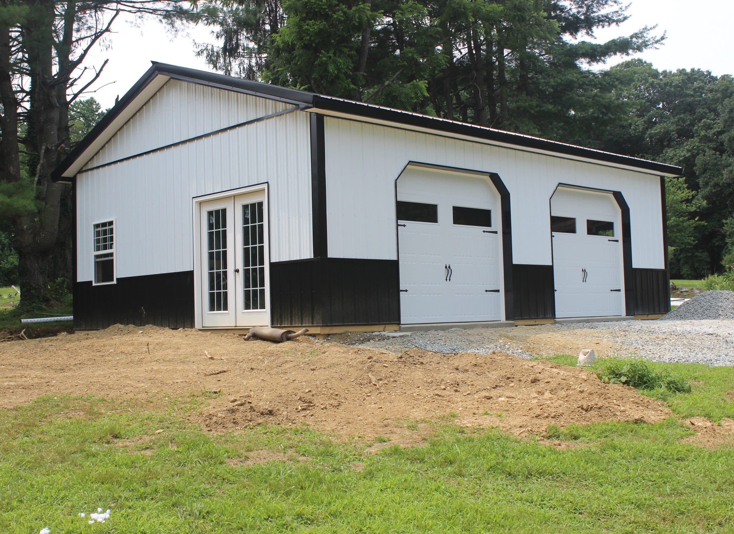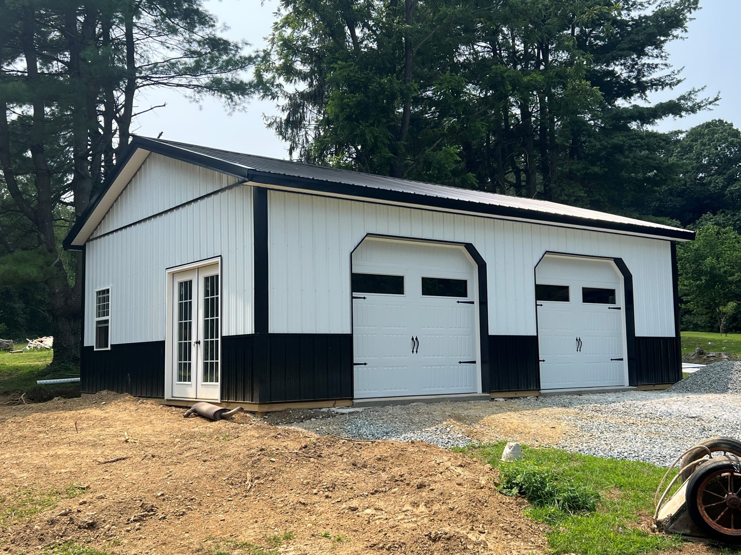 This 24x 32x 10 Garage was built with 2x6 Glulam posts, concrete footings and Sakrete per post, 4/12 pitch prefabricated trusses. The roof, siding and wainscot are Everlast Omni Series 27 Ga. metal. Included in the package are two single hung vinyl windows with grids, one double 15-lite door, one 9-lite entry door and two insulated, raised panel, wood grain overhead doors.