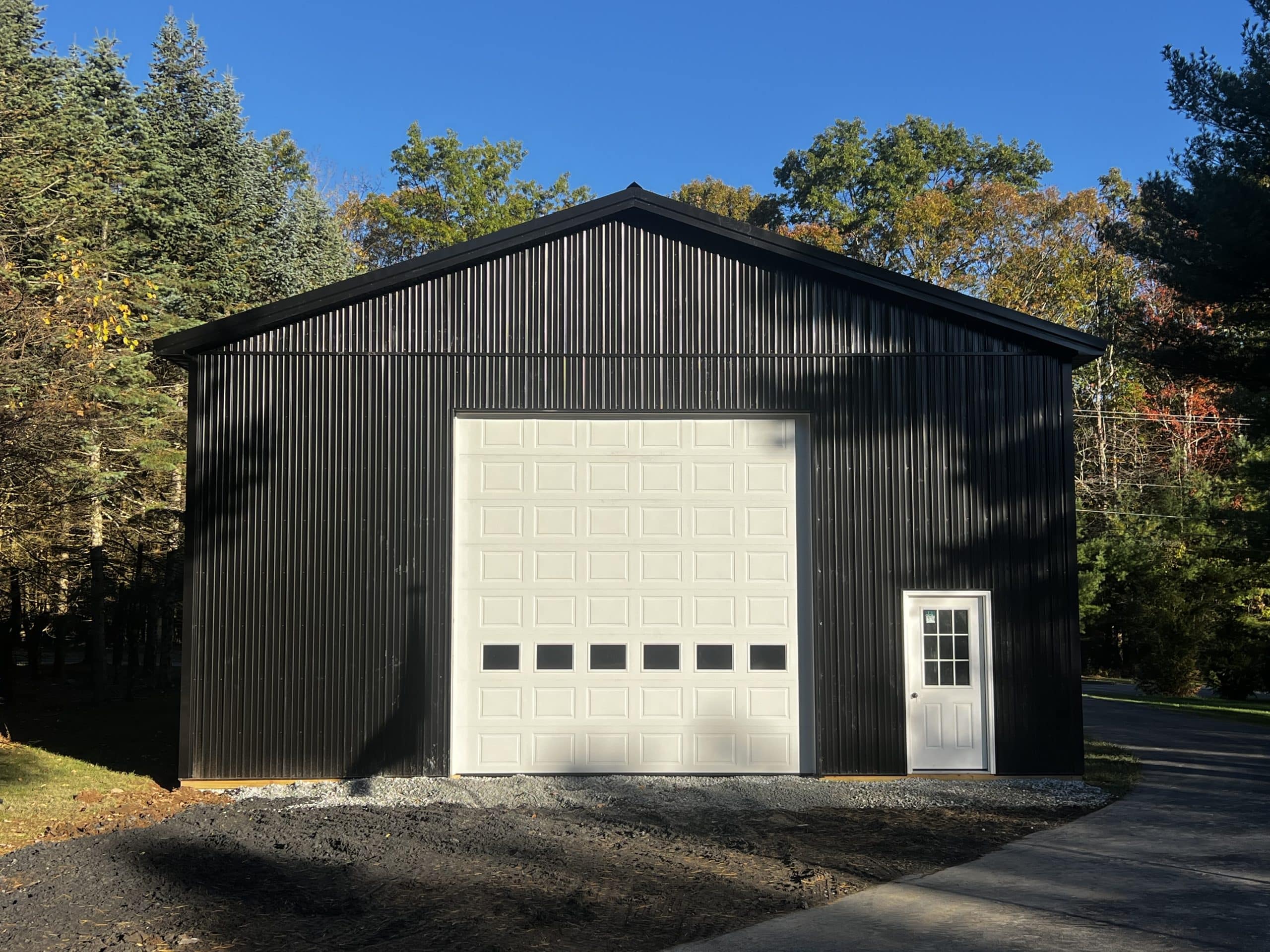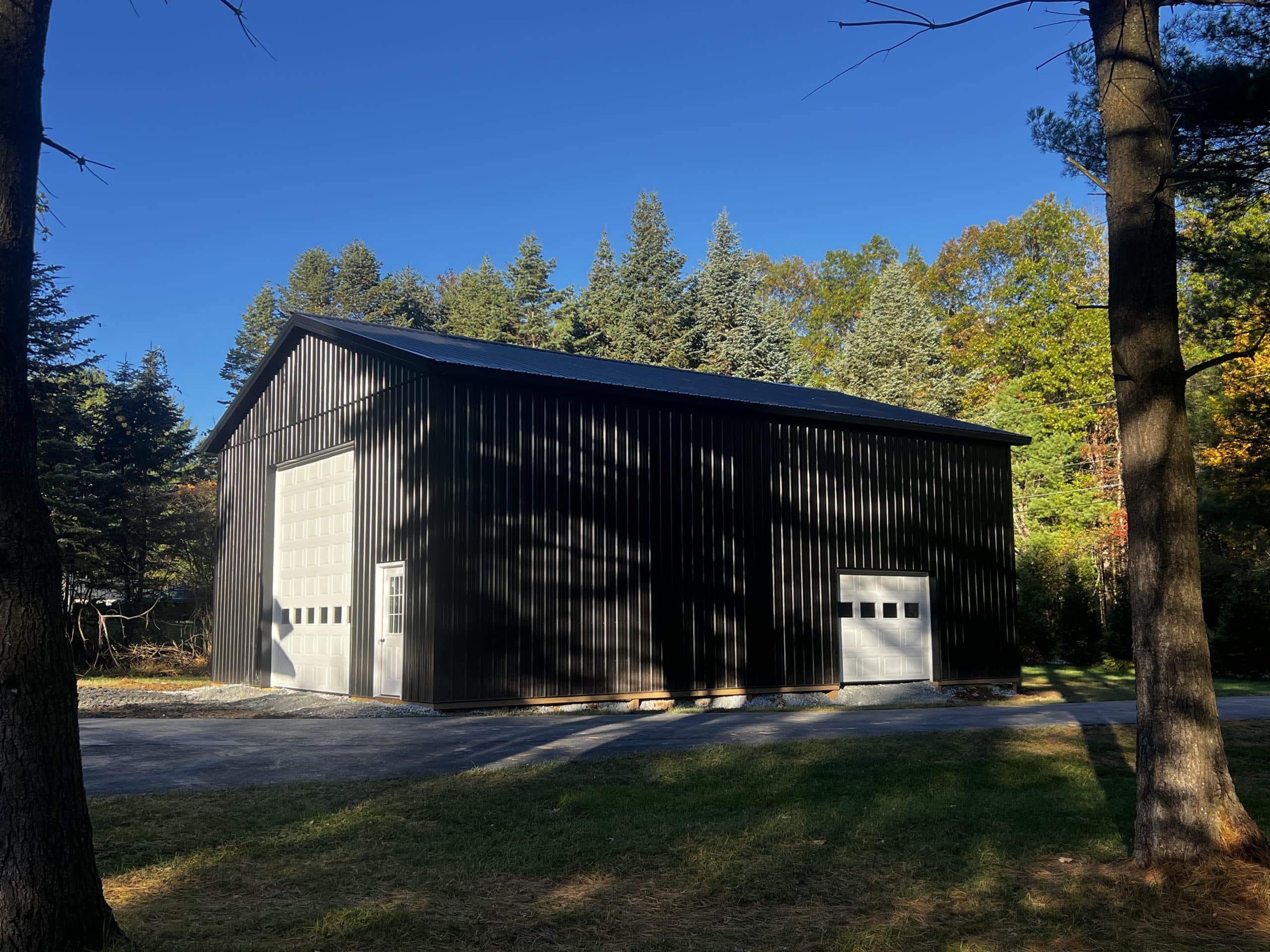 Materials for 34x 44x 16' pole building, consisting of: Prefabricated 4/12 pitch trusses, Double 2x12 MSR truss bearers, 3-ply 2x6 Glulam posts with concrete foundation block and Sakrete per post. Treated 2x8 skirtboard around perimeter of building. Everlast Lynx Series 28 ga. steel roofing and siding with Vented ridge and soffit and R-9 vapor barrier under roof panels. There are two overhead doors, one entry door and two vinyl single hung windows. This package included interior Everlast ceiling panels, R-30 blown insulation in ceiling and R-19 vinyl-backed insulation in wall areas.