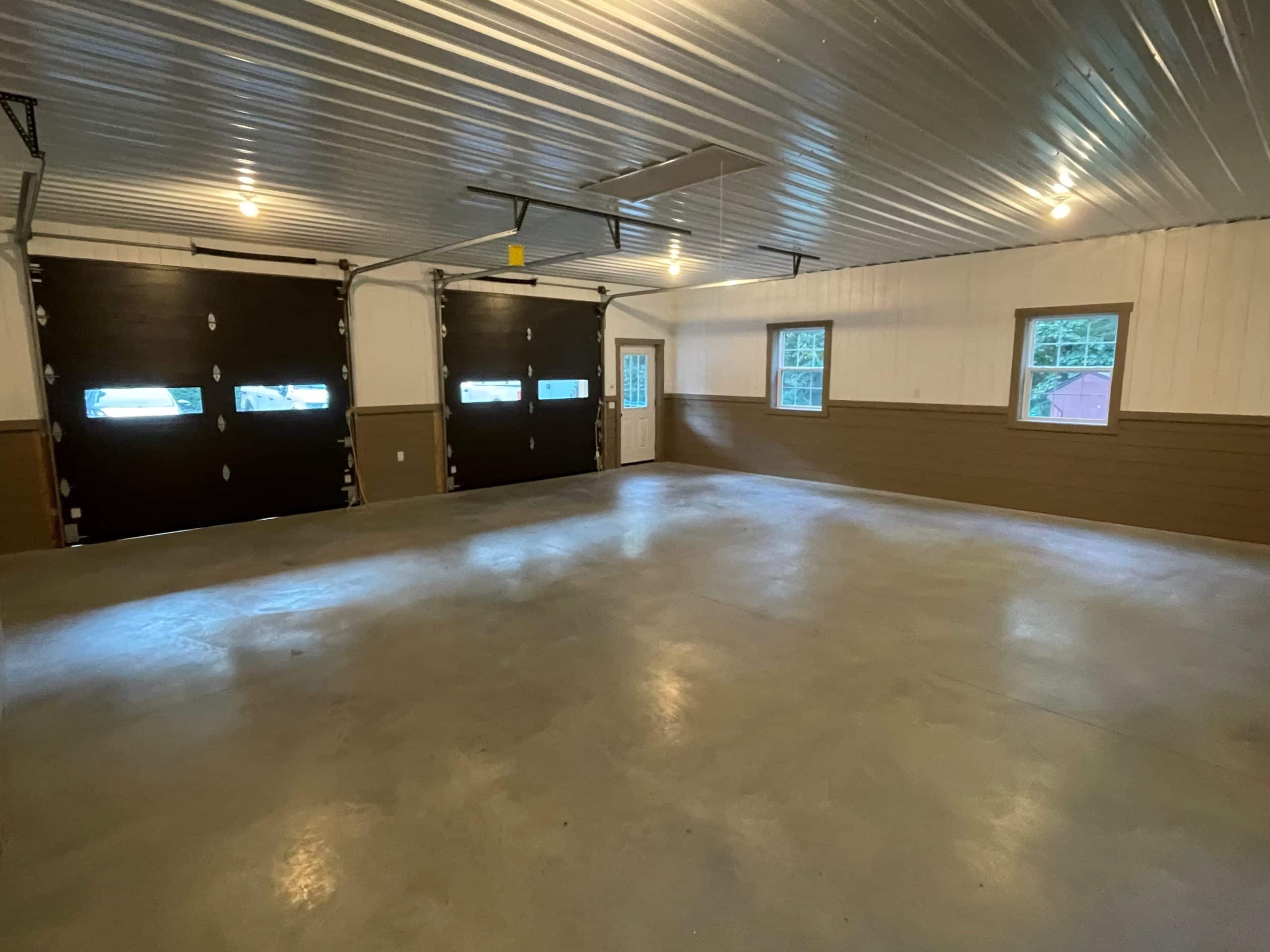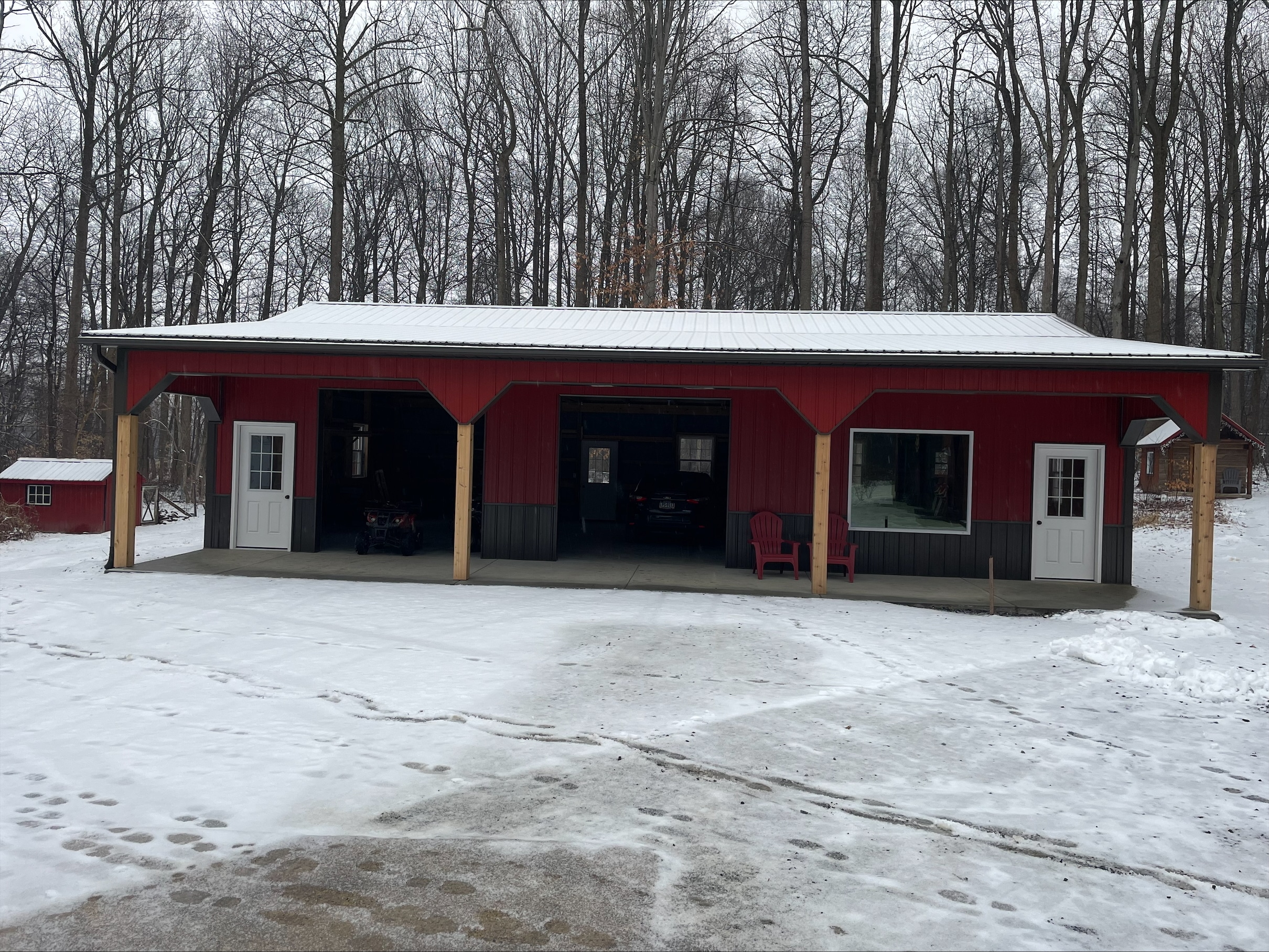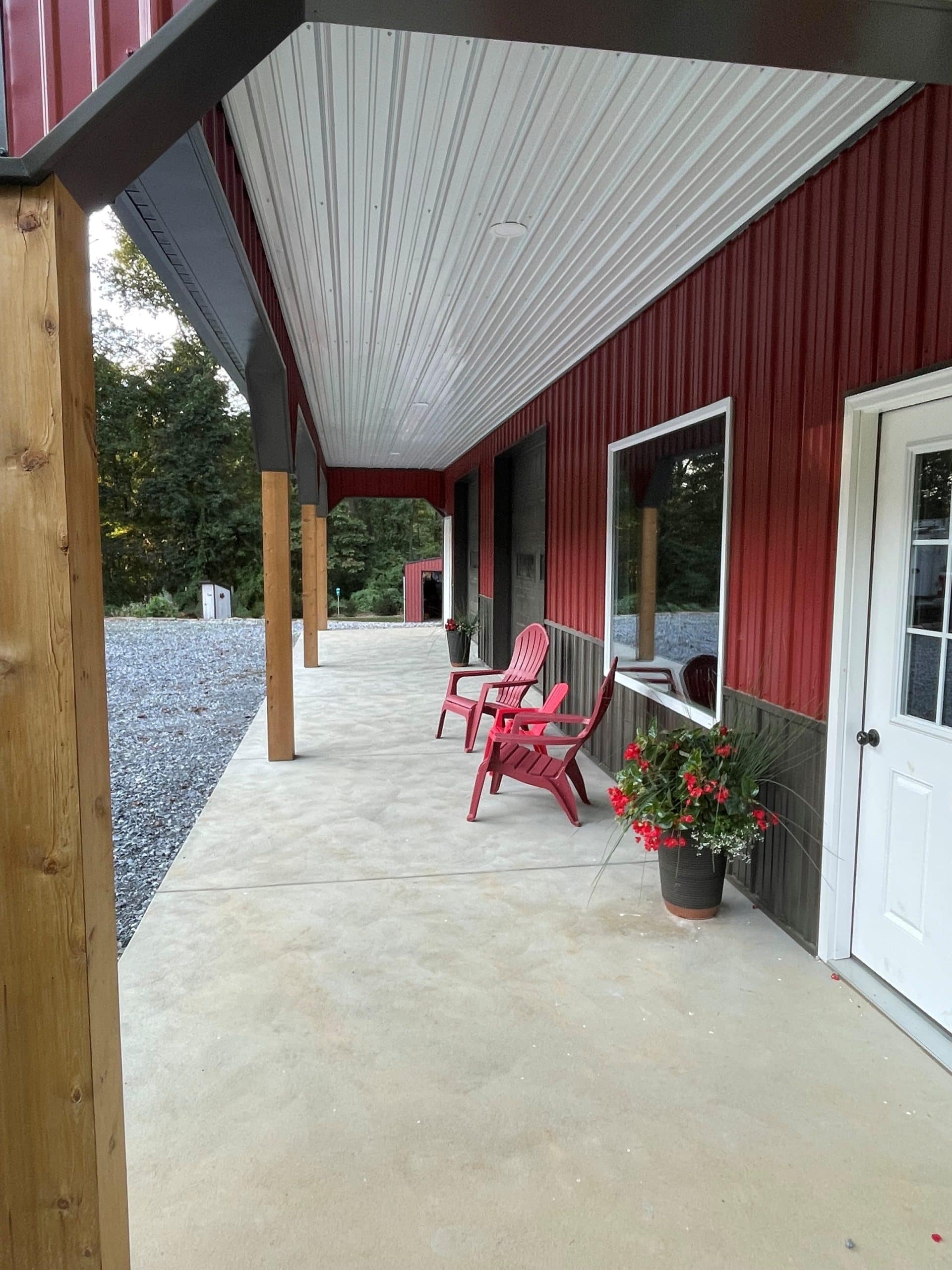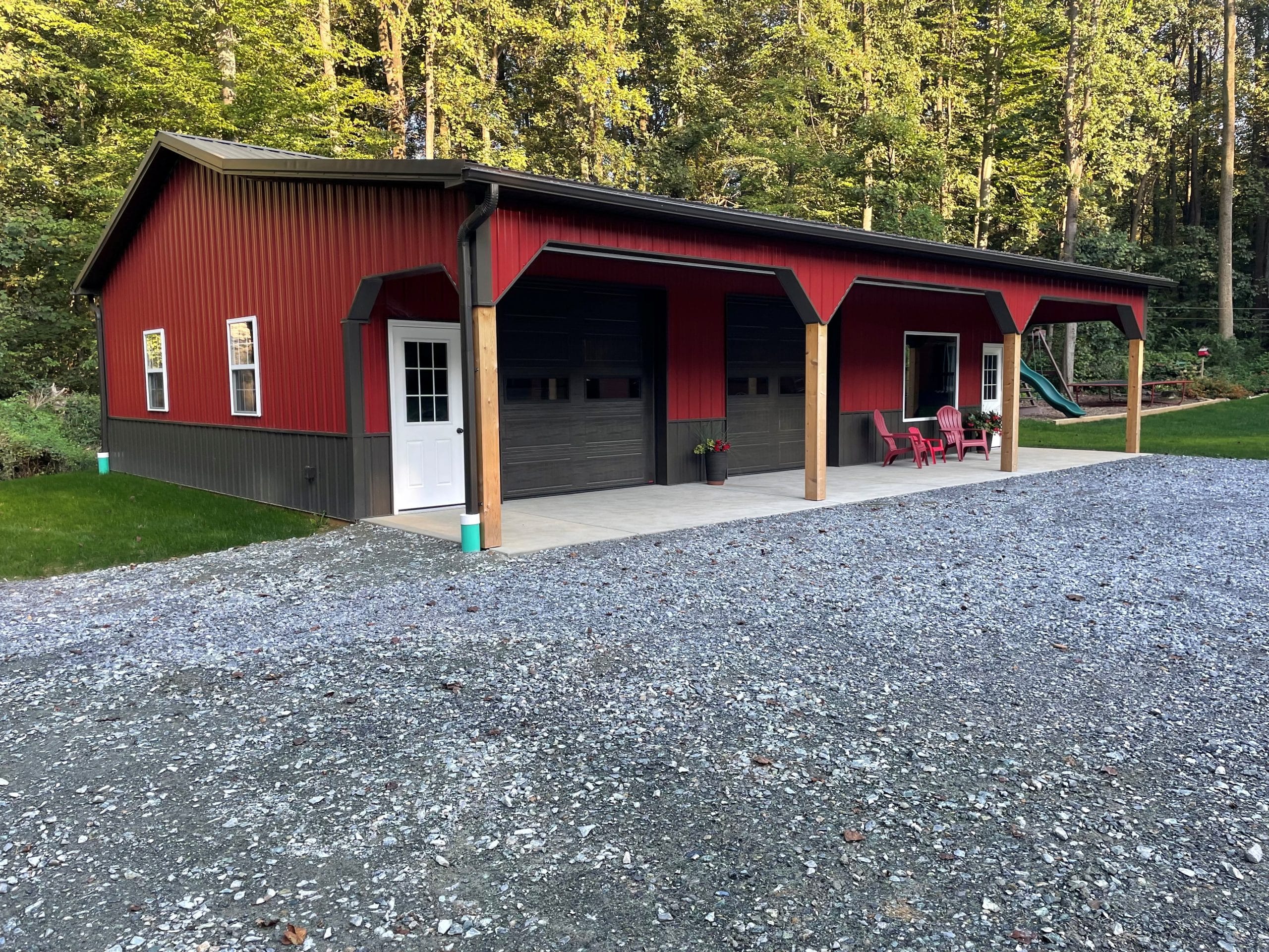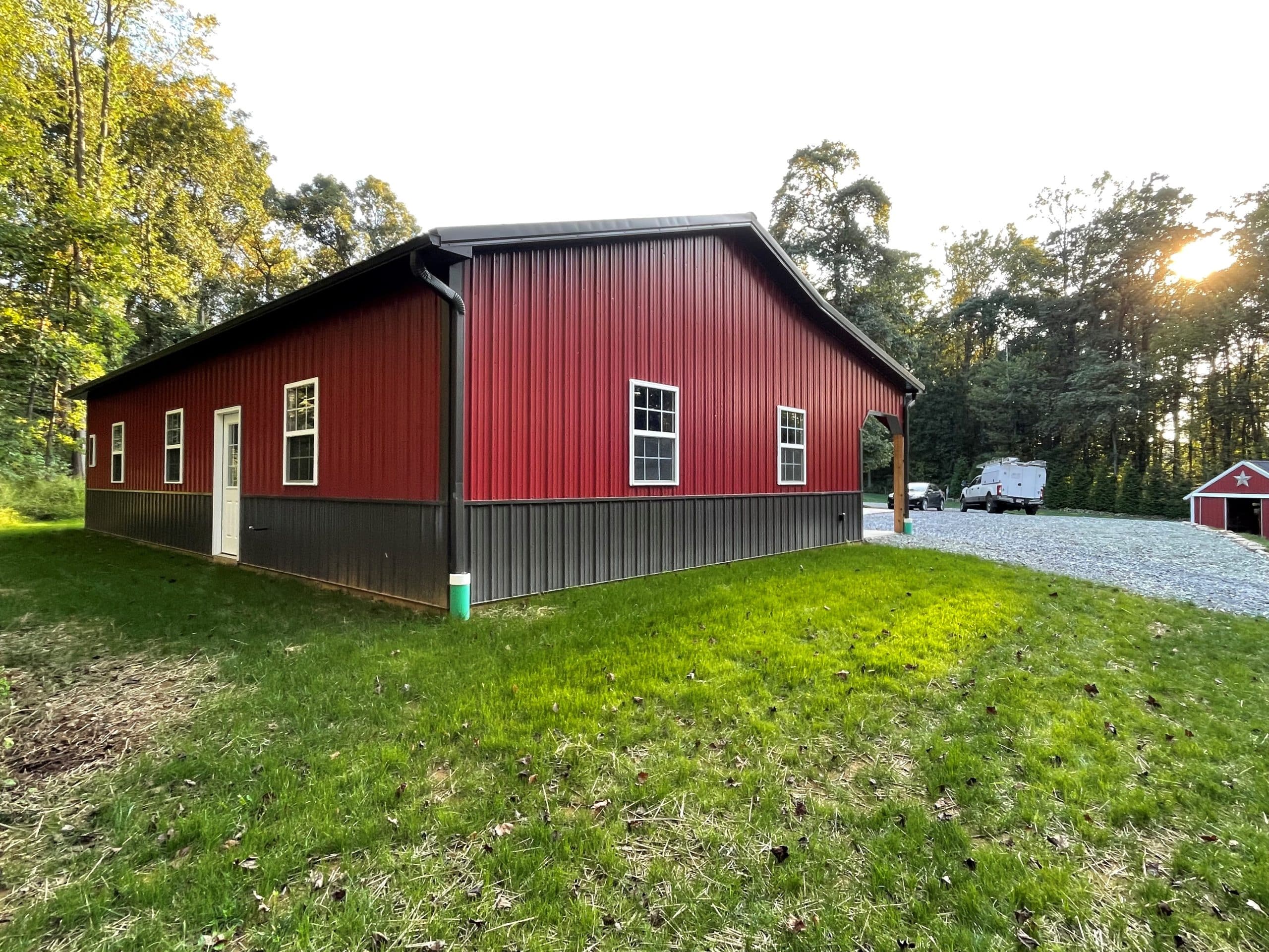 This 38x 48x 10 pole barn with 8’ porch 3-ply 2x6 Glulam posts was built with Green Post Wraps, 5x16 precast concrete footer block with Sakrete per post,2-ply 2x12 SYP headers, pre-fabricated porch trusses with 4/12 roof pitch, 2/12 roof pitch on porch, 12” overhangs on eaves and gables with vented metal soffit. Everlast 28 Ga. LYNX Series metal roof & siding with 4’ wainscot on all sides. Therma Guard R-9 vapor barrier on roof and vented closures under ridge cap, foam closure strips at eaves. This package includes two insulated, raised panel wood grain overhead doors, two 9-lite fiberglass entry doors, and eight single hung vinyl windows. Everlast 29 Ga. Economy series metal on porch ceiling with beam wrapped with fascia.