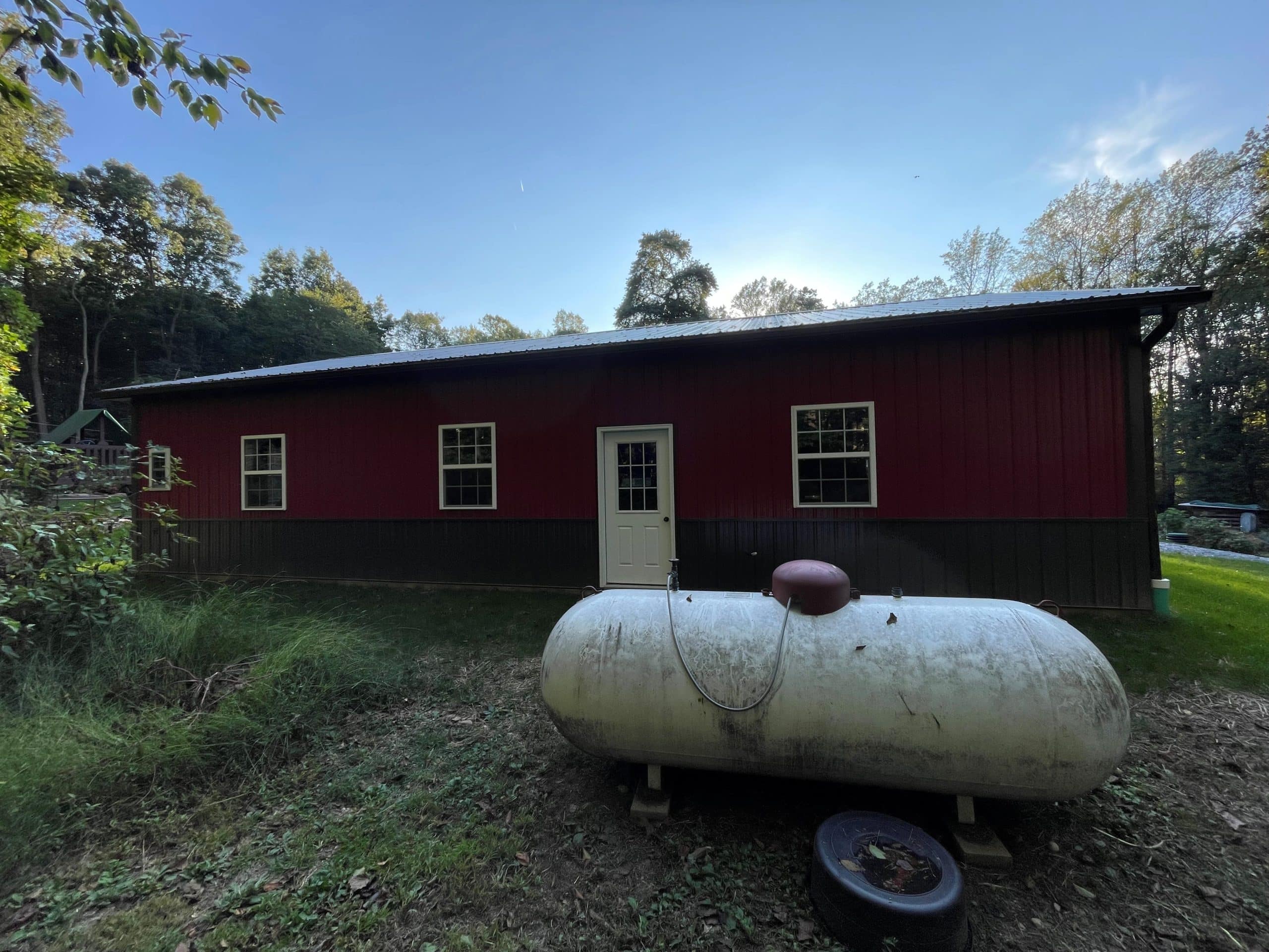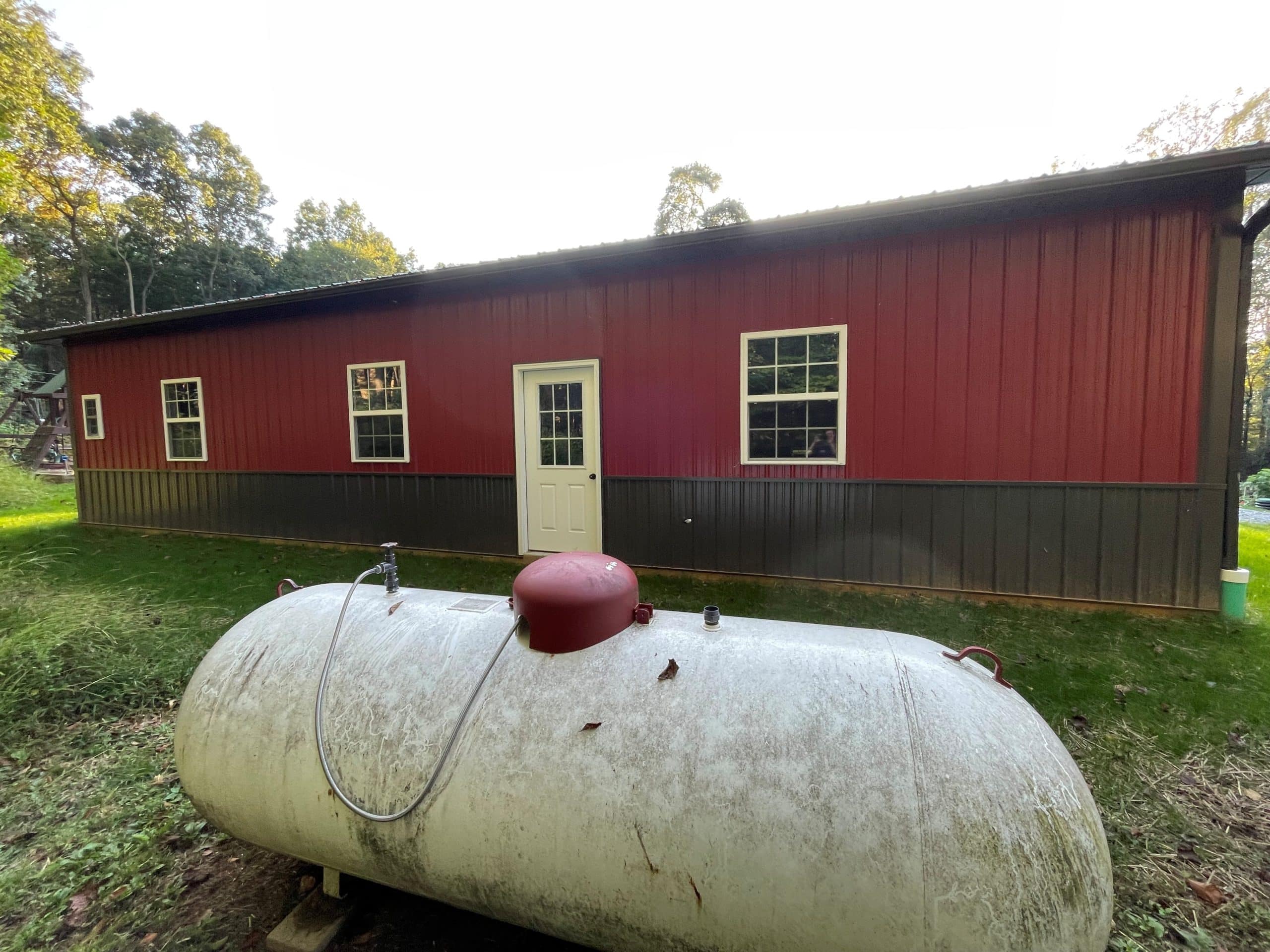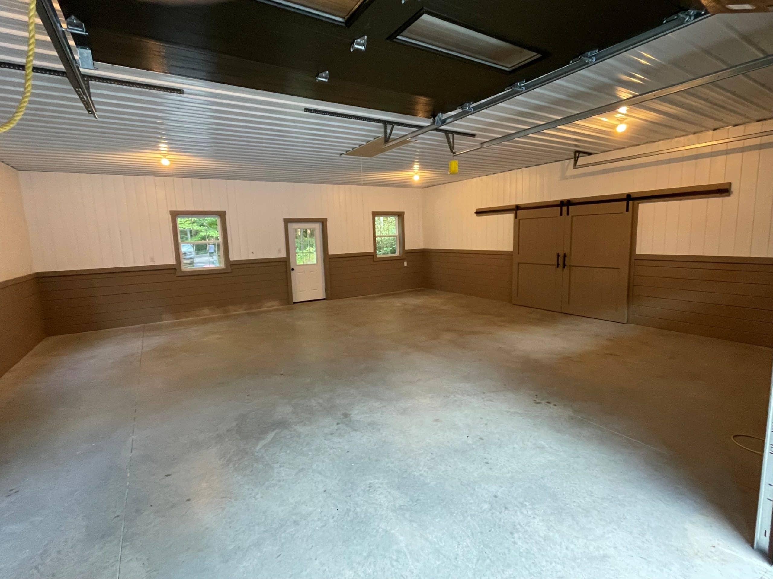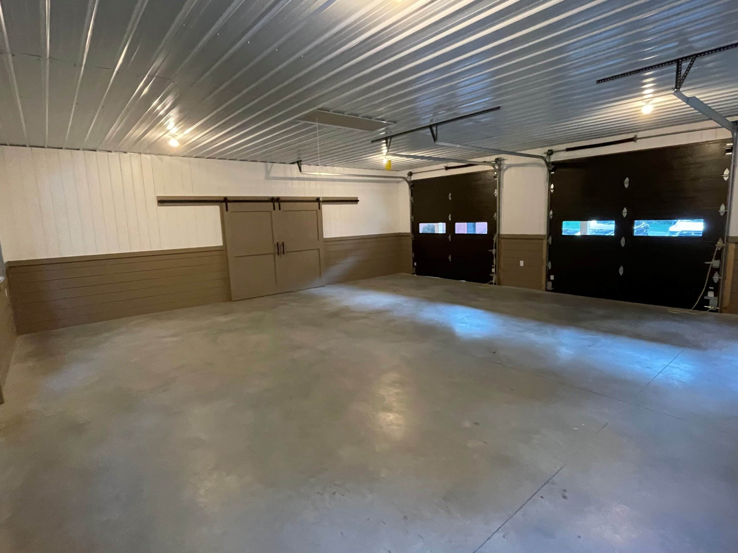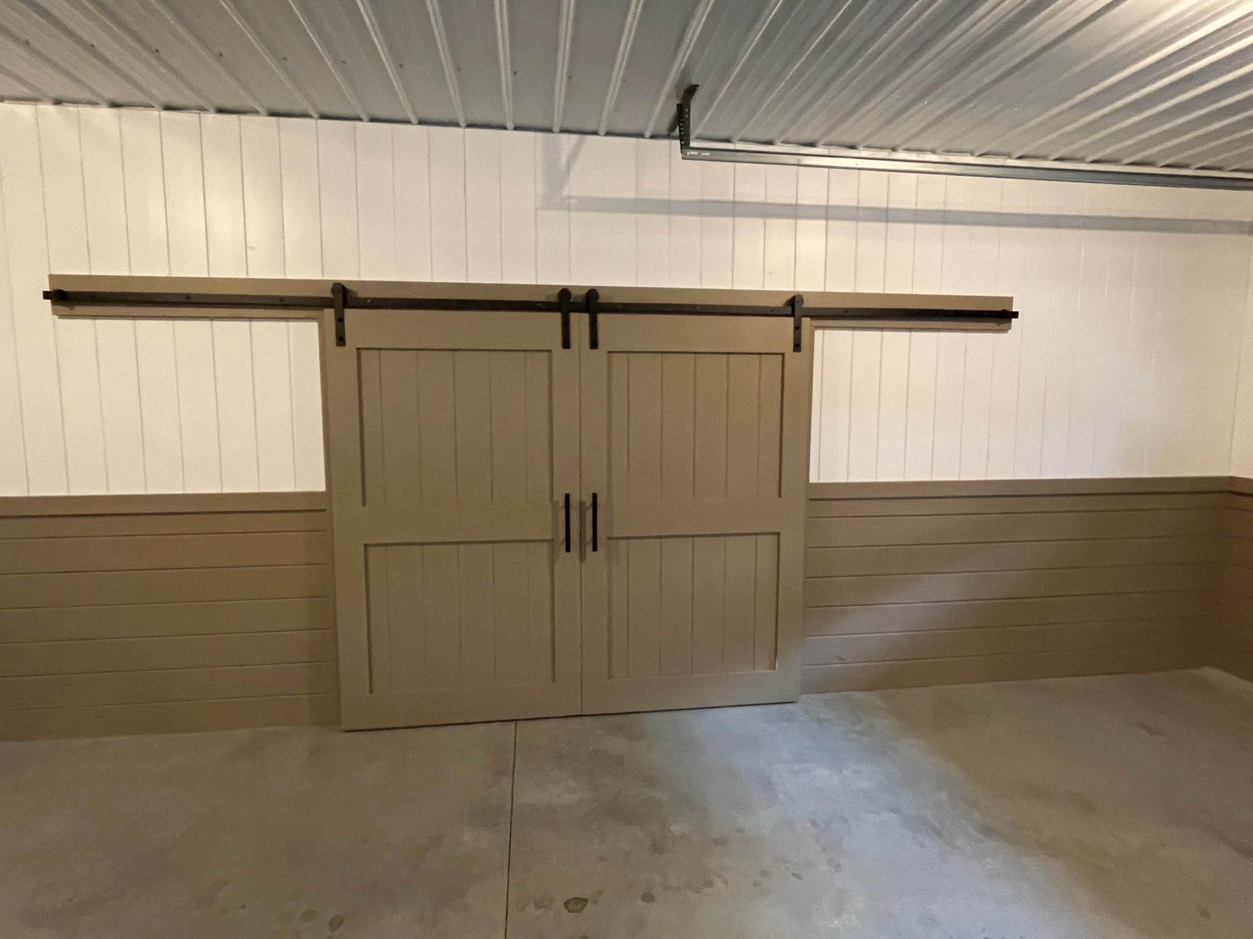 This 38x 48x 10 pole barn with 8’ porch 3-ply 2x6 Glulam posts was built with Green Post Wraps, 5x16 precast concrete footer block with Sakrete per post,2-ply 2x12 SYP headers, pre-fabricated porch trusses with 4/12 roof pitch, 2/12 roof pitch on porch, 12” overhangs on eaves and gables with vented metal soffit. Everlast 28 Ga. LYNX Series metal roof & siding with 4’ wainscot on all sides. Therma Guard R-9 vapor barrier on roof and vented closures under ridge cap, foam closure strips at eaves. This package includes two insulated, raised panel wood grain overhead doors, two 9-lite fiberglass entry doors, and eight single hung vinyl windows. Everlast 29 Ga. Economy series metal on porch ceiling with beam wrapped with fascia.
